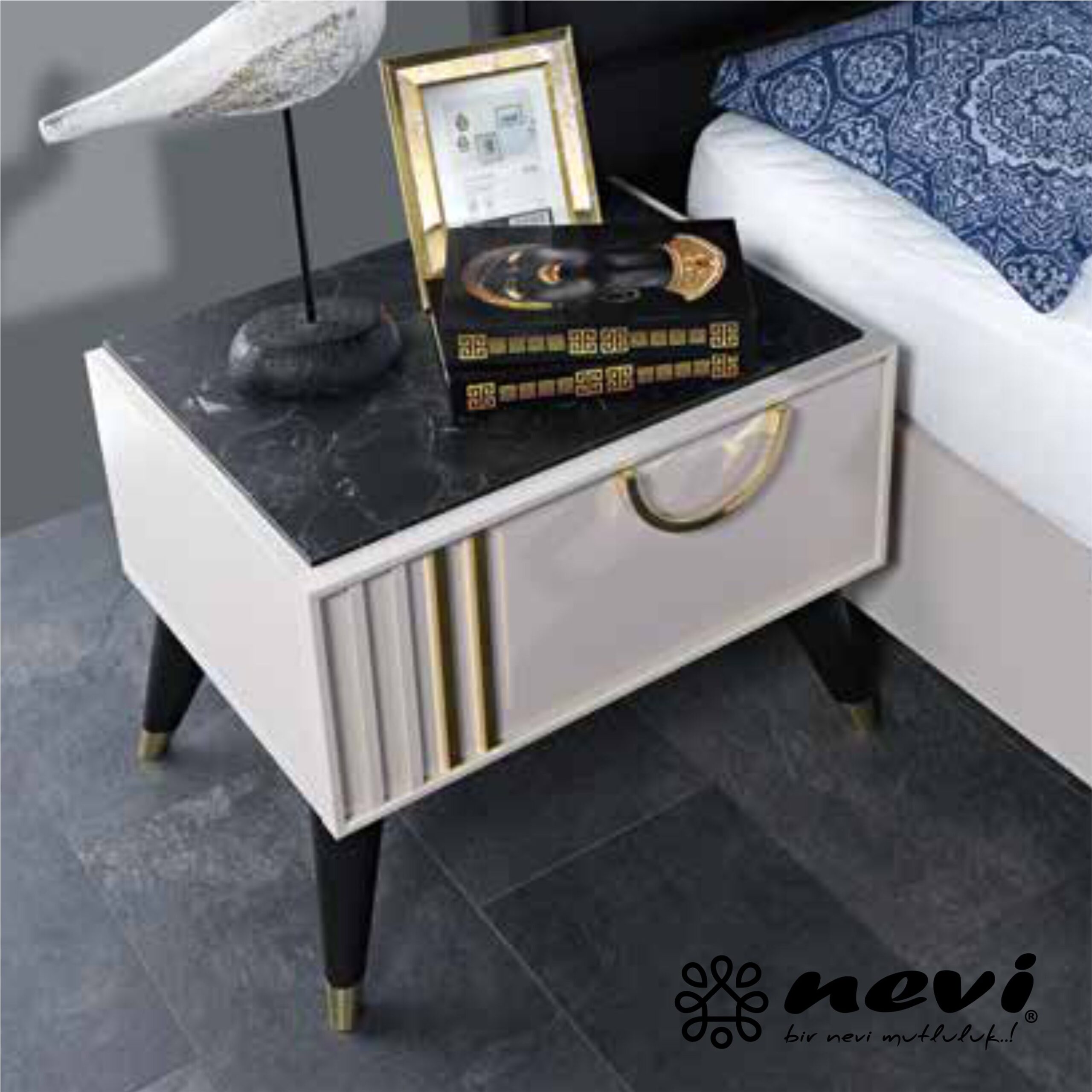 - The shiny gloss at the table top with the gold highlights enlightens a royal look to the bedroom.