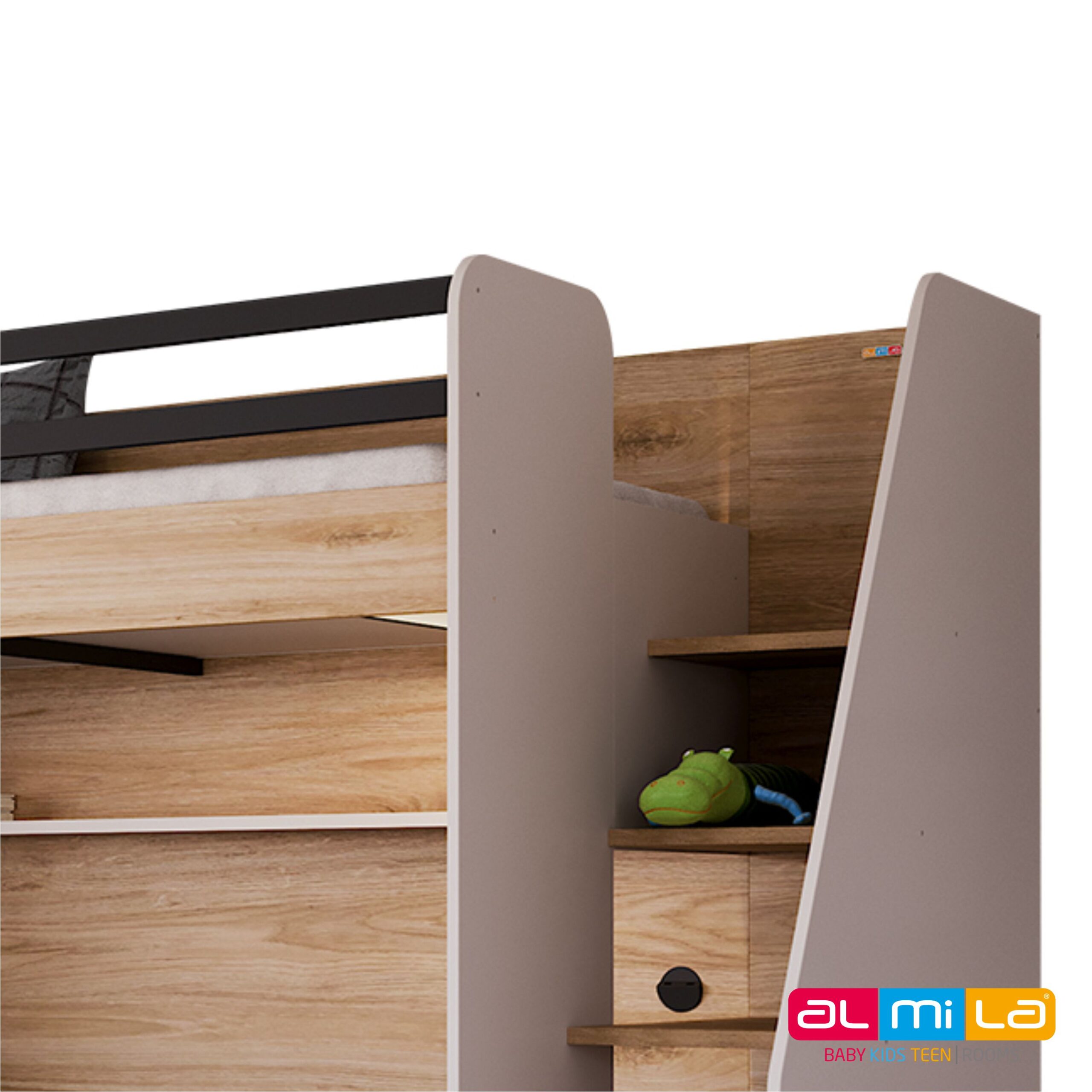 Available from Size: Bunk bed frame size: W256.4 x D100.8 x H190.9 cm Single bed size: W98 x D205.6 x H99.5 cm Pull-out bed size: W95.6 x D200 x H24.5 cm Color: Oak & Grey